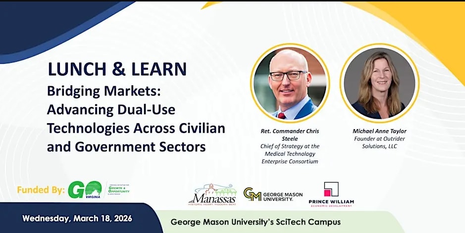 Join the Innovation District, anchored by George Mason's SciTech campus in Prince William County and the City of Manassas, for an upcoming Lunch & Learn on dual-use innovation and how technologies developed for civilian markets are also shaping national security.